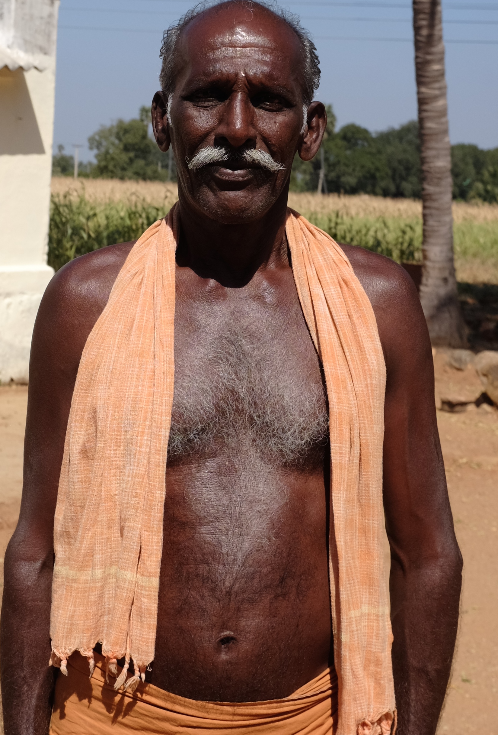 Proud and glistening. A handsome headman strikes a pose outside his homestead on a farm on the road to Palani