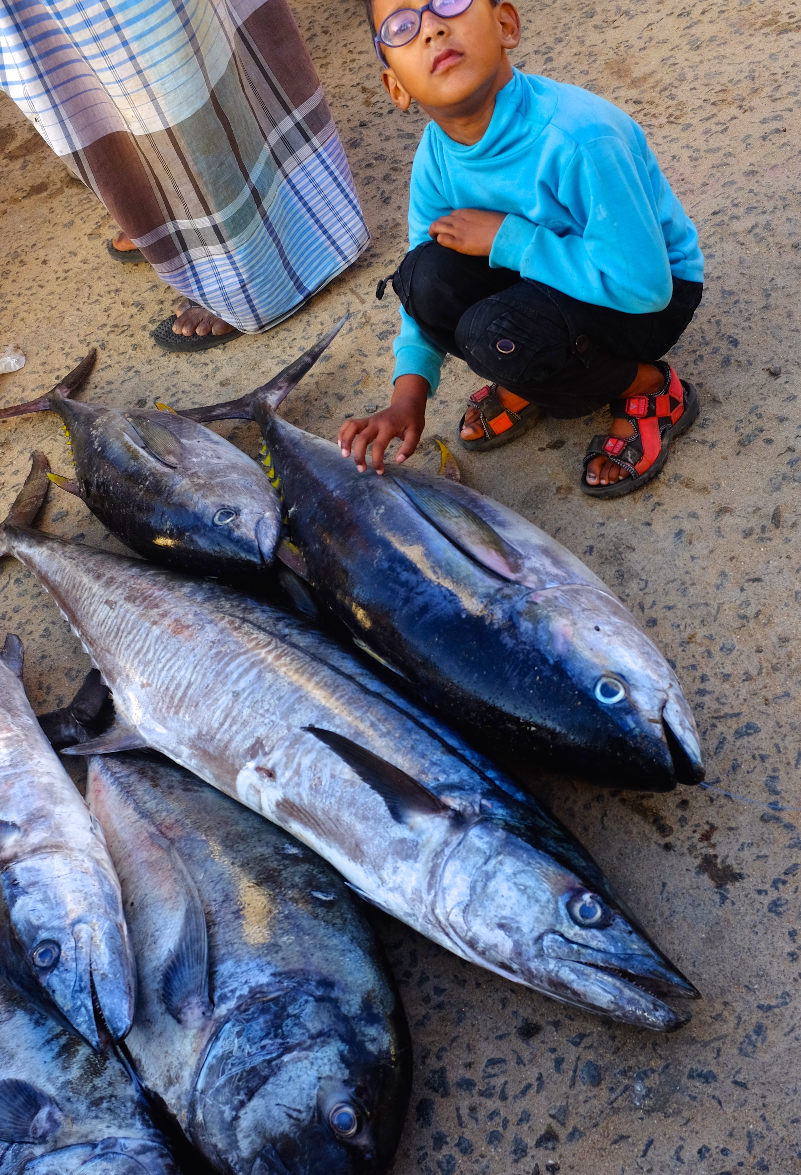 Boy squatting next to auctioned fish, Kanyakumari